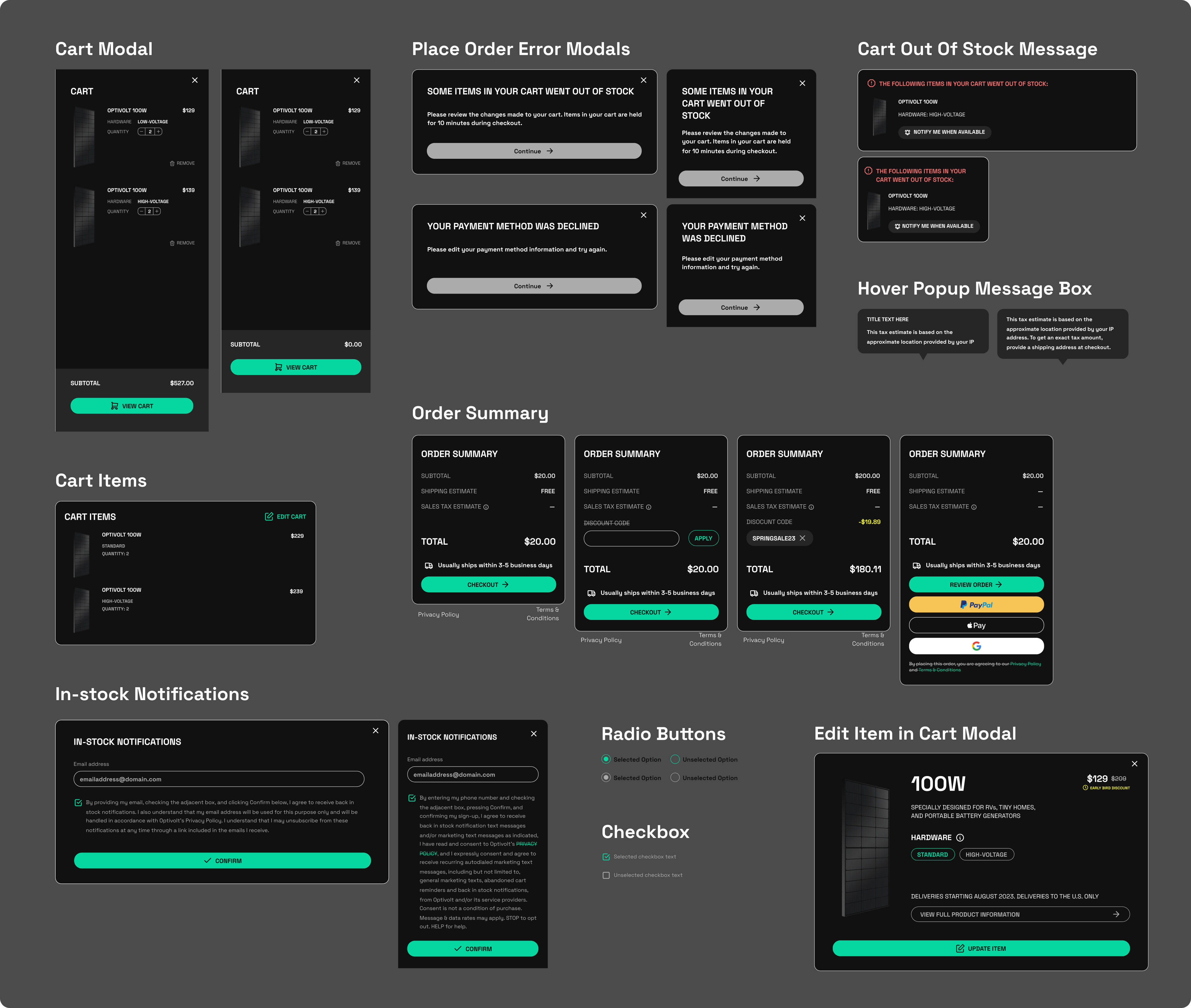 I was tasked with designing a user-friendly purchase flow for Optivolt’s online shopping experience. The product page needed to be redesigned to include UI to indicate when items were low or out of stock. Optivolt had been using Stripe’s template checkout pages, which was jarring for users when they navigated from the brand’s website to checkout flow. Subsequently, the new checkout flow needed to match the brand’s established design language.